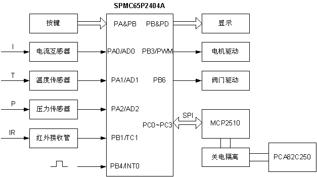 产生执行机构的驱动信号: 工业控制现场会有多种执行机构,如电机、电阀门等,正对各种每种执行机构,MCU会输出相应的驱动信号,以控制这些机构。SPMC65P2404A具有2路12位的PWM输出能力,有2路比较输出功能,同时,每个I/O口都具备驱动LED的能力。利用SPMC65P2404A的这些功能,并配合相应的驱动电路,就可以有效控制电机、电阀门等。