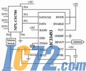 发射接口电路如图2所示。无线电发送模块MC33493可进行OOK或FSK两种调制,工作在300~450MHz频段,采用PLL频率合成技术,频率稳定性好,具有较小的发射功率,最大发射功率达 0.18mW。其数据速率可达9.6Kb/s,工作电压为1.9~3.6V,功耗低,发射时电流为11.6mA,待机状态电流仅为0.8μA(工作温度在125℃)。