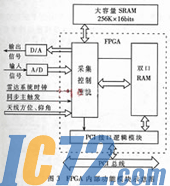 设计中利用FPGA实现64位/MHz的PCI接口逻辑,进行实时信号采集和传输控制。由于FPGA具有层次化的存储器系统,其基本逻辑功能埠可以配置成16×1、16×2或32×1的同步RAM,或16×1的双端口同步RAM,因此可以在FPGA内部配置高双口RAM作为信号传输的数据缓冲器。同时,为了节省FPGA的内部逻辑资源,在FPGA外围配置了适当的SRAM用来存储数据。