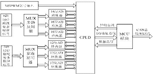 根据该系统功能和性能要求以及传统的基于单一的单片机的数据采集系统的缺点,本文设计了结合单片机和CPLD器件的各自优点, 以MCU+CPLD的双片结构设计了高精度的多模冗余的数据采集系统。系统主要由MCU处理模块、CPLD处理模块和ADC阵列、通信模块四个部分组成,其总体硬件框图如图1所示。