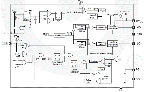 circuit, soft-start, and built-in protection functions. The high-side gate-drive