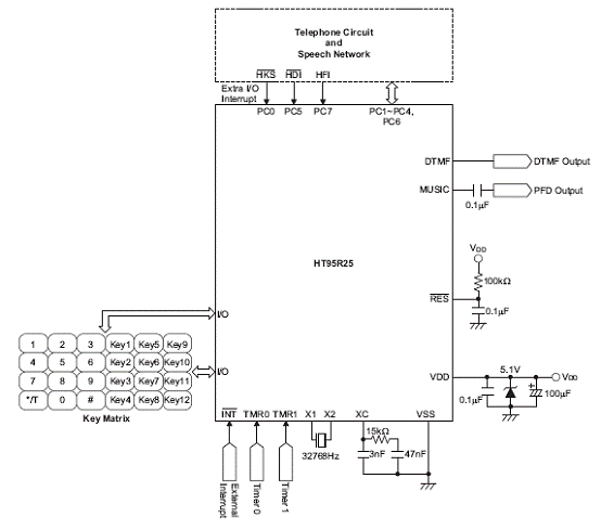 Holtek (盛群半导体)公司的HT95R25是八位电话机微控制器, 具有高集成度、低成本、低耗电和高效能等特性,有16K×16b ROM 2112B RAM和52个I/O,8级堆栈,内建两个16位计时器、一个RTC 计时器及外部中断触发等功能. HT95R25特别适合应用于通讯相关产品,例如多功能电话、无线电话、录音机、家庭安防等.本文介绍了HT95R25主要特性,方框图以及典型应用电路.