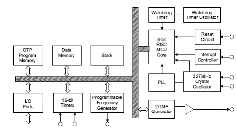 SSOP及64 LQFP的封装型式。利用内建PFD (Programmable Frequency Divider)可产生多种频率变化,搭配发声组件就可产生美妙的音乐,或是应用于红外线传输的载波讯号。
