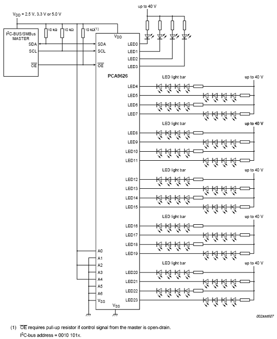 7 hardware address pins allow 126 PCA9626 devices to be connected to the same I2C-bus and to be individually programmed