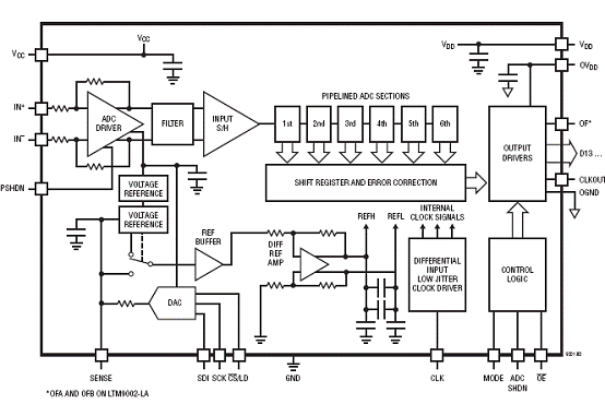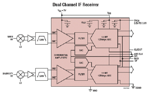 | Linear 公司的LTM9002是14位双路IF接收器子系统,包括两个高速14位ADC,匹配网络,抗混淆滤波器和两个低噪音差分放大器.能对高达300MHz的宽动态范围的IF信号进行数字化. 低噪音差分放大器的固定增益为8dB, 14dB, 20dB 或26dB,输入阻抗为50欧姆,200欧姆或400欧姆,输入到140MHz的SNG为66dB,SFDR为76dB.主要应用在电信,直接变换接收器,蜂窝基站.本文介绍了LTM9002的主要特性,方框图以及双路IF接收器方框图. The LTM9002 is a 14-bit dual-channel IF receiver subsystem. Utilizing an integrated system in a package (SiP) technology, it includes a dual high-speed 14-bit A/D converter,matching network, anti-aliasing filter and two low noise, differential amplifiers. It is designed for digitizing wide dynamic range signals with an intermediate frequency (IF) up to 300MHz. The amplifiers allow either AC- or DC coupled input drive. Lowpass or bandpass filter networks can be implemented with various bandwidths. Contact Linear Technology regarding customization. The LTM9002 is perfect for demanding communications applications, with AC performance that includes 66dB SNR and 76dB spurious free dynamic range (SFDR). Auxiliary DACs allow gain balancing between channels. A single 3V supply allows low power operation. A separate output supply allows the outputs to drive 0.5V to 3.3V logic. An optional multiplexer allows both channels to share a digital output bus. Two single-ended CLK inputs can be driven together or independently. An optional clock duty cycle stabilizer allows high performance at full speed for a wide range of clock duty cycles. 主要特性: Integrated Dual 14-Bit, High-Speed ADC, Passive Filters and Fixed Gain Differential Amplifiers Up to 300MHz IF Range Lowpass and Bandpass Filter Versions Integrated Low Noise, Low Distortion Amplifiers Fixed Gain: 8dB, 14dB, 20dB or 26dB 50Ω, 200Ω or 400Ω Input Impedance Integrated Bypass Capacitance, No External Components Required 66dB SNR Up to 140MHz Input (LTM9002-AA) 76dB SFDR Up to 140MHz Input (LTM9002-AA) Auxilliary 12-Bit DACs for Gain Adjustment Clock Duty Cycle Stabilizer Single 3V to 3.3V Supply Low Power: 1.3W (665mW/ch.) Shutdown and Nap Modes 15mmx11.25mm LGA Package 应用: Telecommunications Direct Conversion Receivers Main and Diversity Receivers Cellular Base Stations ![]() 图1.LTM9002功能方框图(仅显示一路) ![]() 图2.双路IF接收器方框图 |