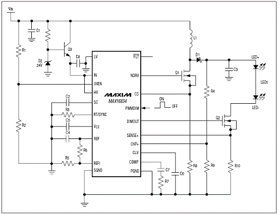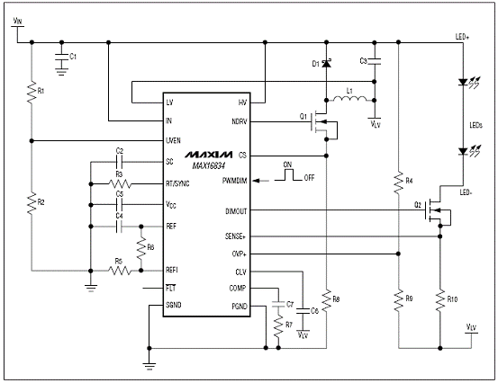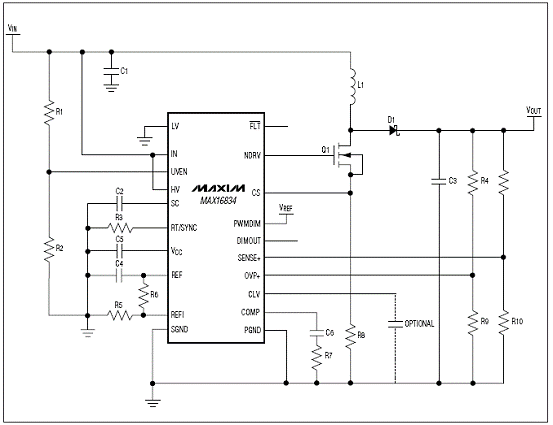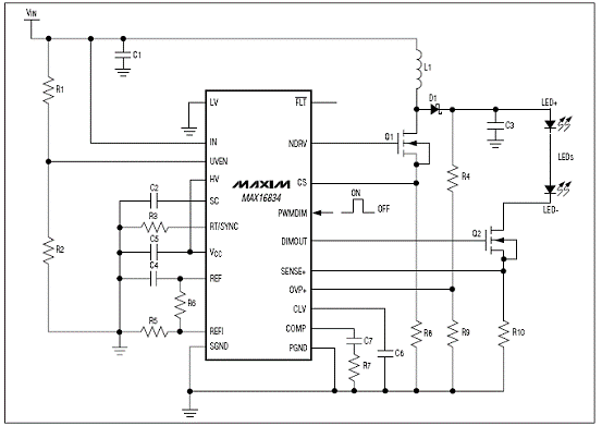 The MAX16834 is a current-mode high-brightness LED (HB LED) driver for boost, buck-boost, SEPIC, and highside buck topologies. In addition to driving an n-channel