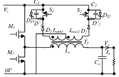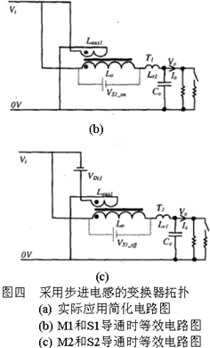多相技术从消除纹波的角度出发的。那么能不能直接从改变电感值的途径,来达到很好动态性能呢?为此人们提出了一种单相采用步进电感技术的VRM[4]。其电路图如图四所示。S1,S2,Lo,Co组成基本的BUCK电路。M1,M2,C1,C2,D1,D2,D1’,D2’,Dz1,Dz2,Laux1和Laux2组成辅助电路,来改善变换器的动态速度。Laux1, Laux2和Lo是耦合电感。在稳态时辅助电路不公作。在Step—up负载突变时,M1导通,Vi使Lo饱和,使Lo相当于短路,使输出电感值减小到Lr,其值很小相当于漏感,从而大大提高了电流变化斜率,其工作波形如图五。在Step—down负载突变时,S2闭合,Lo仍相单于短路,输出电容上的不平衡电荷可以通过Lr快速泄放。可以看出,在稳态时,此电路电感是Lo,瞬态时电感为Lr,因此电路中的电感称为步进电感。