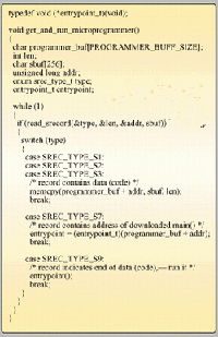 程序1中的代码显示的是下载目标系统和运行微编程器所需要的功能。在这个例子中,目标系统从某个I/O通道(也许是串口)接收文本形式的摩托罗拉S Record文件,将它译码并写到RAM中,然后在传输结束时目标系统跳转到下载代码启动微编程器。