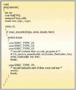微型编程器的顶级代码如程序2所示,这个代码也可以从某些地方接收S Record文件并将其译码。微编程器将新接收到的数据记录在闪存中,当文件传输完成后重新启动系统。虽然过于简单了些(用文本文件来传输大的程序也许不十分可靠),但这个代码表示了微编程器的所有重要特征。