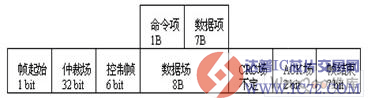 CAN遵从OSI层模型,按照OSI标准模型,CAN结构划分为两层:数据链路层和物理层,它们由CAN控制器的硬件实现电平变换和帧的封装。CAN网络中包括4种不同类型的帧。其中,数据帧将数据由发送器传至接收器;远程帧由节点发送以请求具有相同ID标志符的数据帧;出错帧可由任何节点发送,以控制总线错误;而超载帧用于提供先前和后续数据帧或远程帧之间的附加延时。另外,数据帧和远程帧以帧空间同先前帧隔开。在实际应用中,还需要建立自己的上层协议。在本系统设计中,采用简单实用的“命令项加数据项”结构[3],其完整数据帧结构如图5所示。考虑到工在业控制中,功能一般不多,因此命令项的长度设定为1B(可描述128种命令)。而在本控制系统中,命令所需参数一般不会大于7B,故数据项长度直接设为7B。