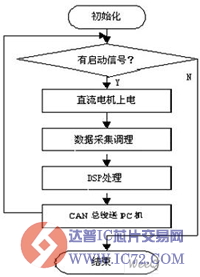 系统的CAN应用节点部分采用的是BasicCAN程序,它包含初始化子程序、发送子程序、接收子程序三个部分。DSP软件编写采用的是TI公司的DSP集成开发环境CCS2000,它支持汇编语言和C语言编程。为了保证程序运行效率,核心算法FFT程序和中断向量表程序采用汇编语言编写,而其它程序都采用C语言编写,使本系统软件具有模块化、结构化、可移植性好和调试方便的特点。系统的软件执行过程是:首先是系统初始化工作,即设置寄存器、配置GPIO、定时器、A/D转换器和外部中断、启动A/D转换。然后检测GPIO有没有启动信号,检测到启动信号后,从另一个GPIO发出控制信号给直流电机加电。从A/D转换器里读取电流信号数据,再通过求平均值得到电机的电流值;对输出脉冲信号的数据进行FFT变换,求出基波的频率,再根据电机的具体型号乘以一个系数得到电机的转速。最后把测试电流和转速送给LCD显示,启动CAN总线传输,把测试结果传输到上位PC机,以对数据进行保存和分析。软件流程如图4所示。