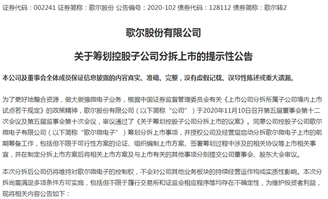公告指出,根据证监会相关政策,歌尔股份于2020年11月10日召开第五届董事会第十二次会议及第五届监事会第十次会议,审议通过了《关于筹划控股子公司分拆上市的议案》。同意歌尔微电子筹划分拆上市事项,并授权公司及经营层启动分拆歌尔微电子上市的前期筹备工作,包括但不限于可行性方案的论证、组织编制上市方案、签署筹划过程中涉及的相关协议等上市相关事宜,并在制定分拆上市方案后,将相关上市方案及与上市有关的其他事项分别提交公司董事会、股东大会审议。