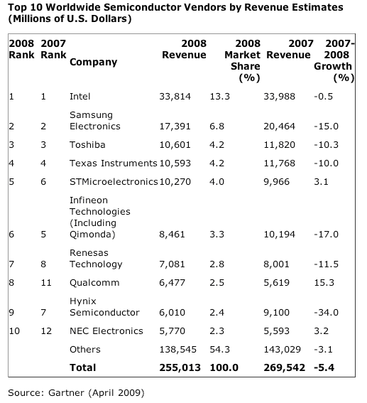 以内存为业务重心的芯片厂,所受影响最深。韩国三星(Samsung)虽维持第 2名,但营收较前年衰退15%至173.9亿美元。英特尔蝉连2008年冠军,营收仅小降0.5%至338.1亿美元。