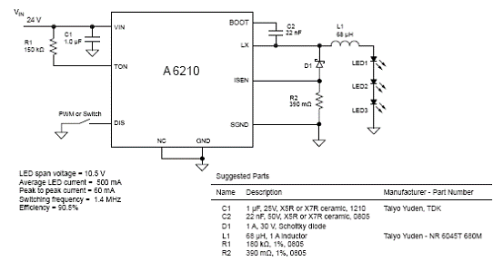 The A6210 is a buck regulator that uses valley current-mode control. This control scheme allows very short switch on-times to be achieved, making it ideal for applications that require high switching frequencies combined with high input voltages and low output LED span voltages.
