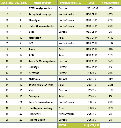 Jazz半导体因为Wispry的可调谐RF-MEMS在手机中的出货而进入前20名,预期2009年将增长20%。而香港华润半导体则因为主要客户Teravicta宣布破产而停业。在全球范围,MEMS代工市场非常细分化。尽管金融风暴,很多项目仍在进行,例如Silex的8英寸生产线计划2009年底完成。