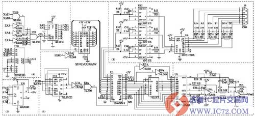 如图 4 中虚线框(4)所示,采用一片3/8 译码器74LS138 对地址译码,实现对控制卡3路伺服单元的片选,而XA0 则专门用于对LM628 进行读写控制,这样得出的地址信号是连续的(0XF60~0XF65)。另外,采用一片四位二进制码比较器74LS85 实现DSP 对双口RAM的读写片选。片选地址信号范围为0~7FF,这刚好寻址双口RAM 2K 范围内的所有空间。